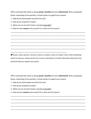 Of Mice And Men Crooks Vs Lennie Teaching Resources